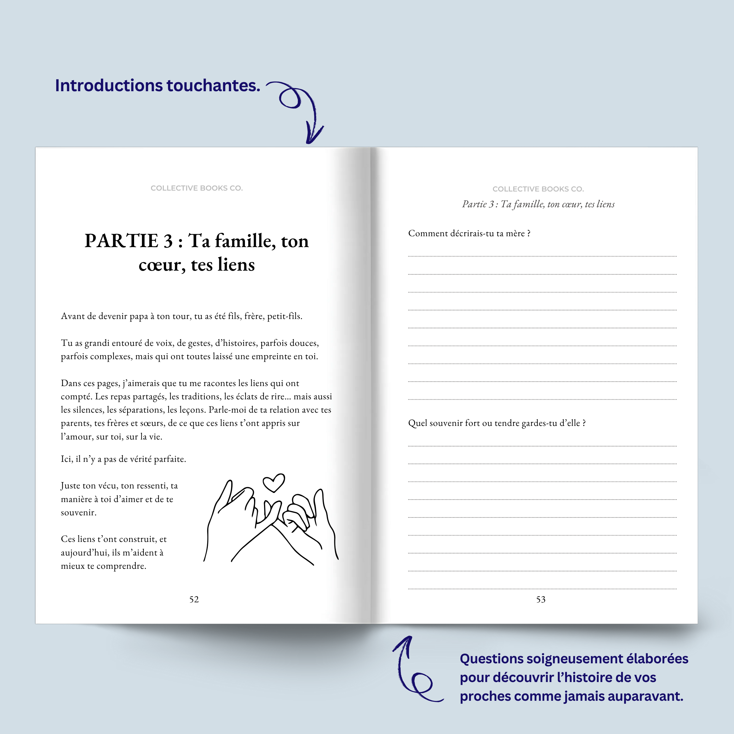 Ce journal est pensé pour tous les membres de la famille : parents, grands-parents, oncles, tantes… Toute personne dont vous souhaitez garder l’histoire précieuse. Même votre partenaire.