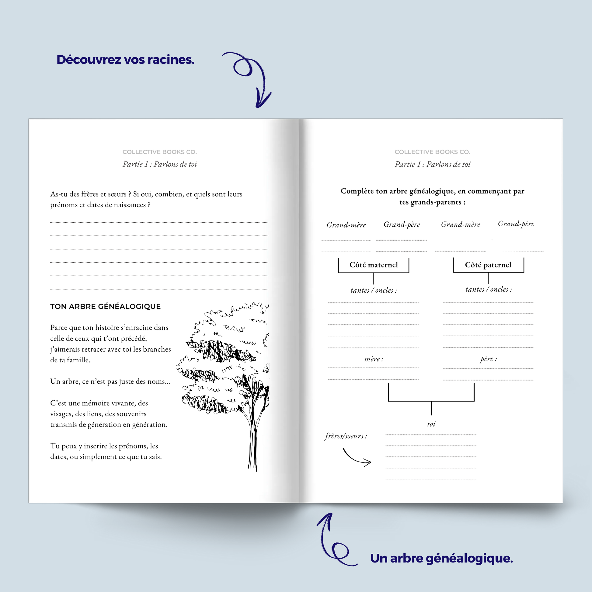 120+ questions inspirantes, un arbre généalogique, des pages libres et un emplacement pour vos photos.