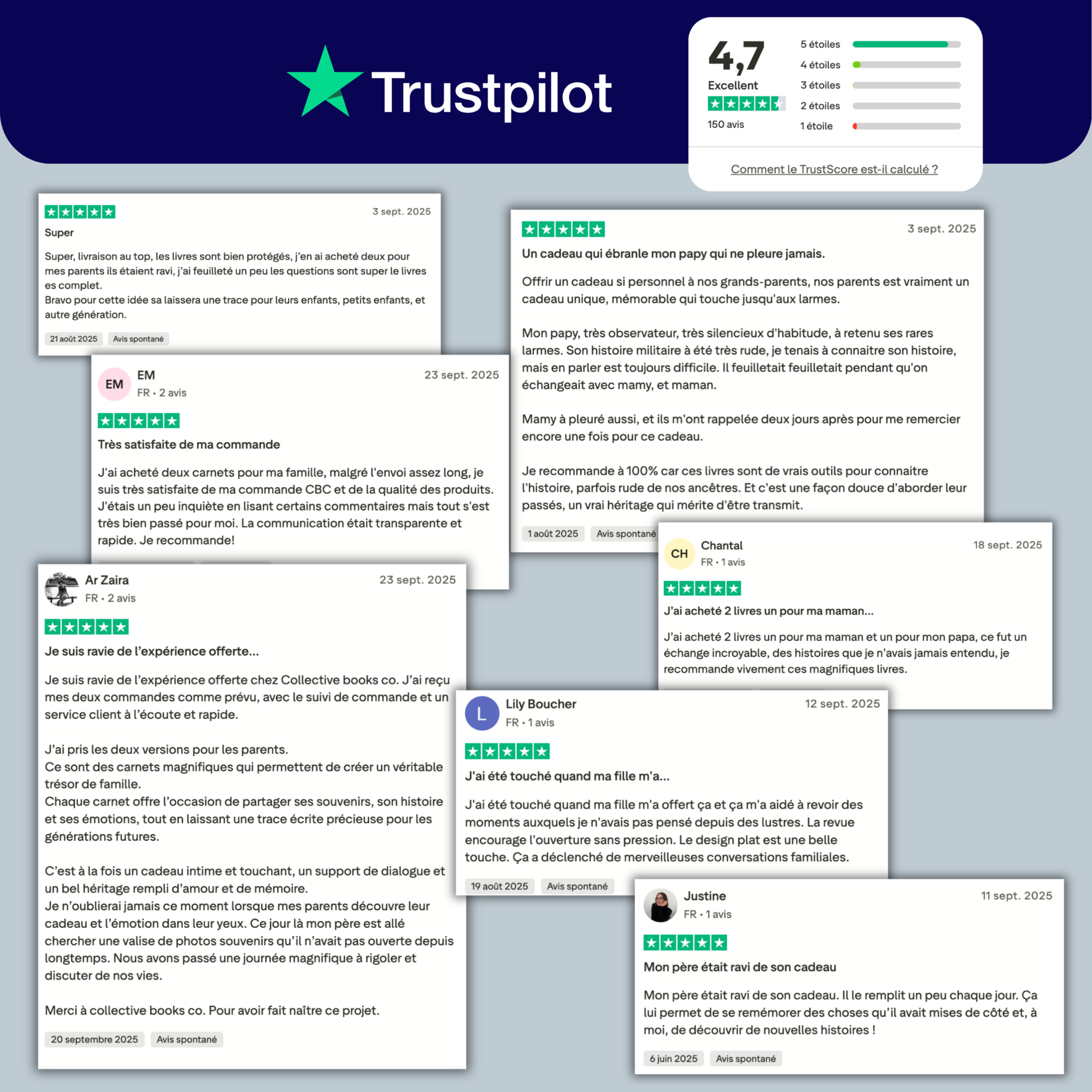 Ce journal est pensé pour tous les membres de la famille : parents, grands-parents, oncles, tantes… Toute personne dont vous souhaitez garder l’histoire précieuse. Même votre partenaire.